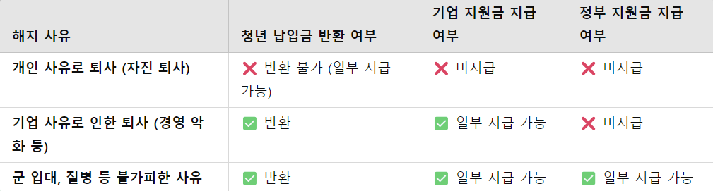 ✔ 2년 미만 근속 시 → 본인 납입금 일부만 반환, 기업 & 정부 지원금 미지급